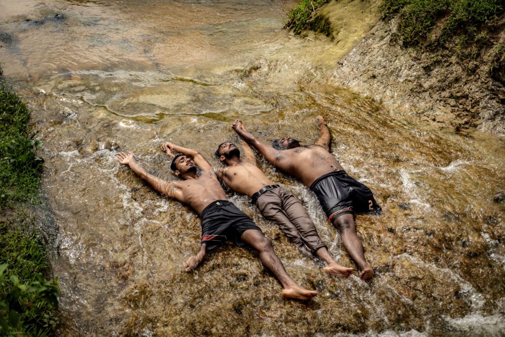 Three amputee footballers lie in a flowing river, arms linked and raised above their heads—capturing a moment of joy, rest, and resistance in a journey that reimagines sport as solidarity, not spectacle.