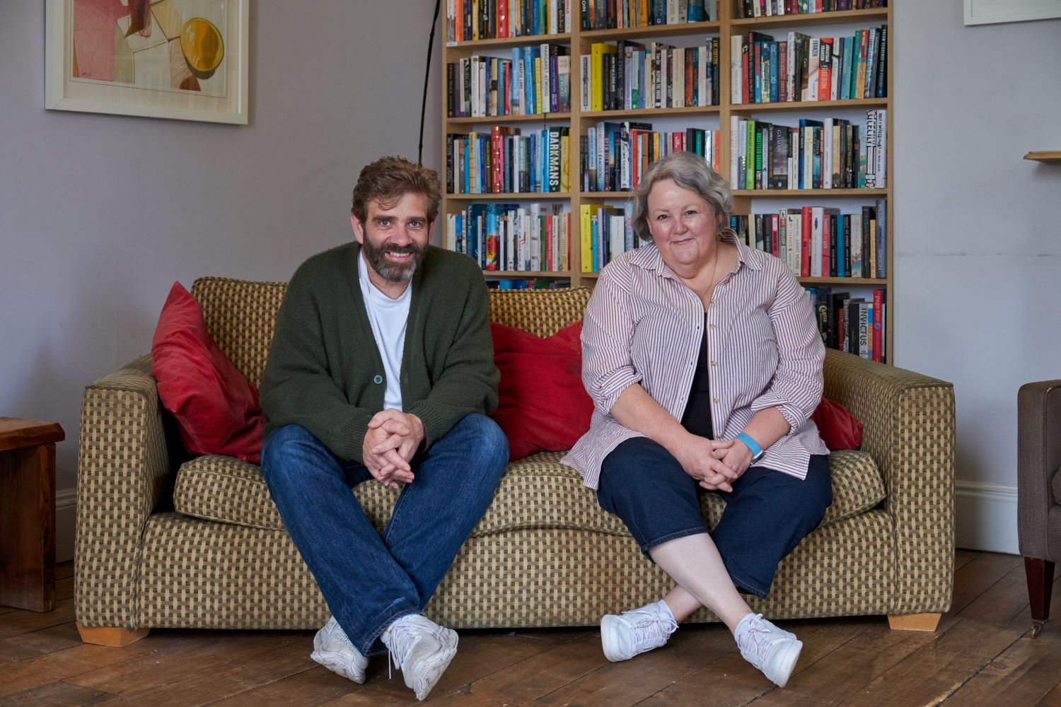Richard and Claire leaning forward on the sofa photographed at The Hurst May 2024 by Dan Haworth-Salter
